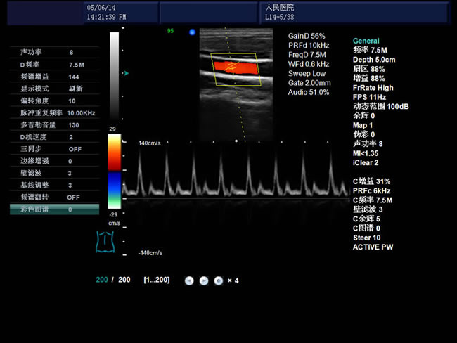 彩色血流圖像調(diào)節(jié)參數(shù):多普勒頻率、取樣框位置和大小、基線、彩色增益、偏轉(zhuǎn)角度、壁濾波、累積次數(shù)等。