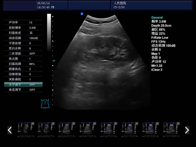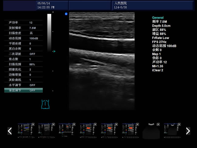 頻率、幀頻、B模式總增益、C模式總增益、D模式總增益、菜單、注釋、灰階帶、穿刺引導(dǎo)線、PRF、壁濾波、血流相關(guān)、累積次數(shù)、TI熱指數(shù)、MI機(jī)械指數(shù)